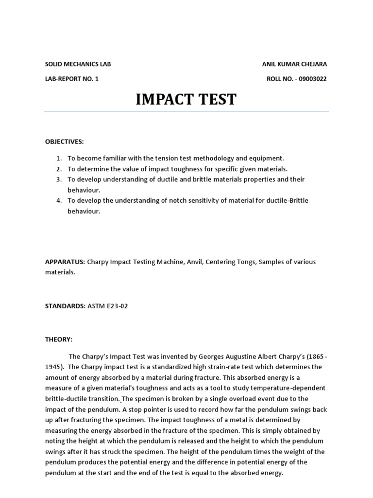 Charpy impact test lab report. From results shown below we determined that the a transition is from ductile failures to brittle failures. Impact testing lab report mt1010 engineering materials lab report title the experiment of the impact toughness of metallic materials objectives to study the.